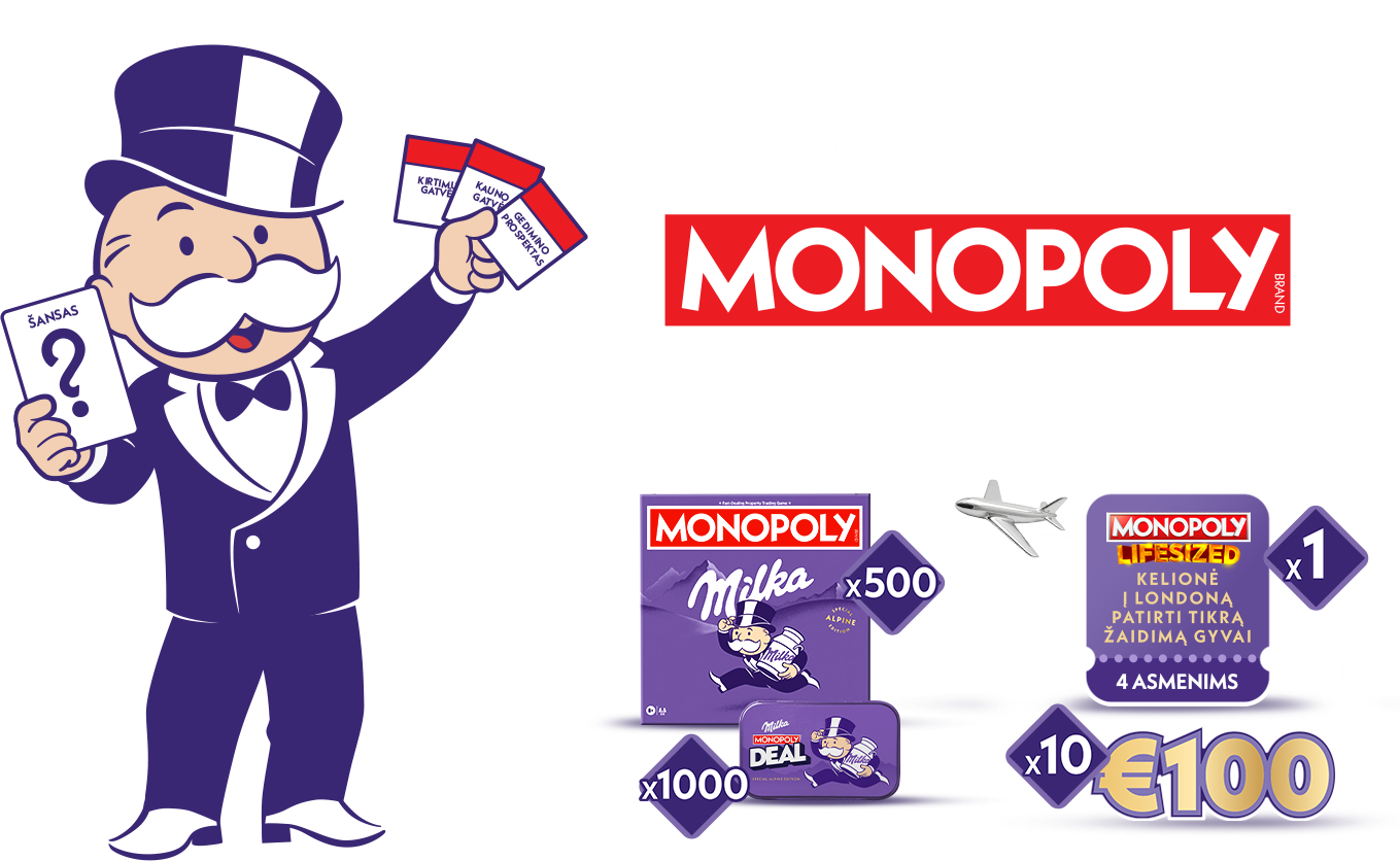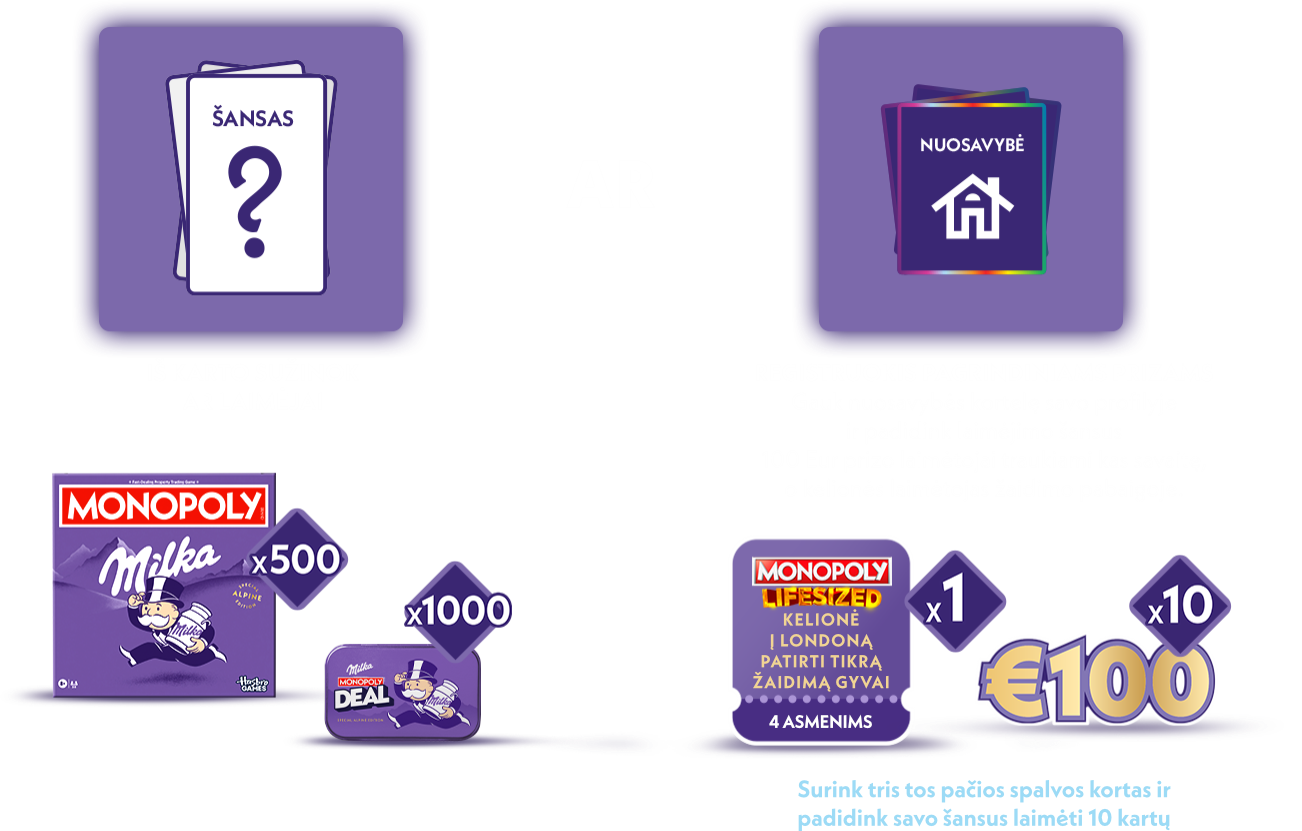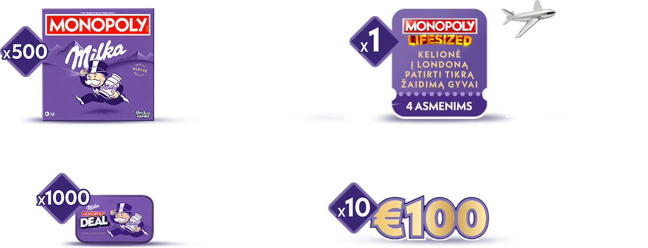 2.1.3.2. Didžiųjų prizų registracija – Dalyvis dalyvauja tik didžiųjų prizų traukime. Didieji prizai yra: savaitiniai 100 EUR piniginiai prizai (10 prizų), kurių laimėtojai išaiškinami ir paskelbiami kas savaitę nurodytomis datomis (nuo 2026-04-13 iki 2026-06-15), ir pagrindinis prizas – kelionė į Londoną keturiems asmenims, kurio laimėtojas bus išaiškintas ir paskelbtas 2026 m. birželio 16 d., t. y. dieną po Akcijos pabaigos. Pasirinkus šią registraciją, Dalyvis gauna virtualią Monopoly nuosavybės (property) kortelę ir nebegali dalyvauti momentinių prizų traukime su šia konkrečia kvito registracija. Kiekviena nauja pirkimo kvito registracija su didžiųjų prizų pasirinkimu suteikia Dalyviui papildomą virtualią nuosavybės kortelę. Kortelės yra suskirstytos spalvomis. Surinkus tris vienodos spalvos korteles, Dalyvio šansai laimėti didįjį prizą padidėja 10 kartų. Surinkus šešias vienodos spalvos korteles, šansai padidėja 20 kartų. Kiekvienos trys papildomos vienodos spalvos kortelės (t. y. 9, 12, 15 ir t.t.) toliau didina šansus atitinkamai po 10 kartų (30, 40, 50 ir t.t.). Norint rinkti daugiau kortelių ir didinti laimėjimo šansus, Dalyvis turi pirkti naujus Akcijoje dalyvaujančius Milka produktus (nurodytus šių Taisyklių 4.1 punkte) ir registruoti naujus pirkimo kvitus, kiekvieną kartą pasirenkant didžiųjų prizų registraciją. Pagrindinį prizą (kelionę) gali laimėti pilnametis (ne jaunesnis kaip 18 metų) Dalyvis. Laimėtojas gali nurodyti tris papildomus kelionės dalyvius.