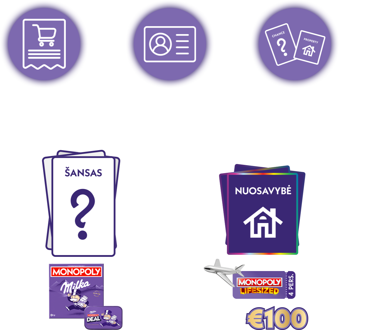 3.7. Dalyviai, pasirinkę momentinių šanso prizų registraciją, gali iškart sužinoti rezultatą, ar laimėjo Monopoly stalo žaidimą ar Monopoly Deal korteles. Momentiniai prizai paskiriami atsitiktine tvarka pagal Organizatoriaus nustatytą algoritmą. Dalyviai, pasirinkę didžiųjų prizų registraciją, iš pradžių dalyvauja tiek savaitiniuose 100 EUR pinigų prizų traukimuose, tiek pagrindinio kelionės prizo traukime, tačiau laimėję vieną savaitinį 100 EUR prizą, jie automatiškai nebedalyvauja kituose savaitiniuose traukimuose ir pagrindinio kelionės prizo traukime. Šie Dalyviai gauna virtualias Monopoly nuosavybės (property) korteles, kurios yra suskirstytos spalvomis. Surinkus tris vienodos spalvos nuosavybės korteles, Dalyvio laimėjimo tikimybė savaitiniuose ir pagrindiniame traukime padidėja 10 kartų. Surinkus šešias vienodos spalvos nuosavybės korteles, laimėjimo tikimybė padidėja 20 kartų. Organizatorius pasilieka teisę bet kuriuo metu keisti galimų laimėti prizų asortimentą tik dėl svarbių priežasčių, įskaitant force majeure aplinkybes, techninius sistemos sutrikimus, prekių prieinamumo problemų ar kitas objektyvias aplinkybes, apie tai iš anksto informuodamas Dalyvius Akcijos internetinėje svetainėje.